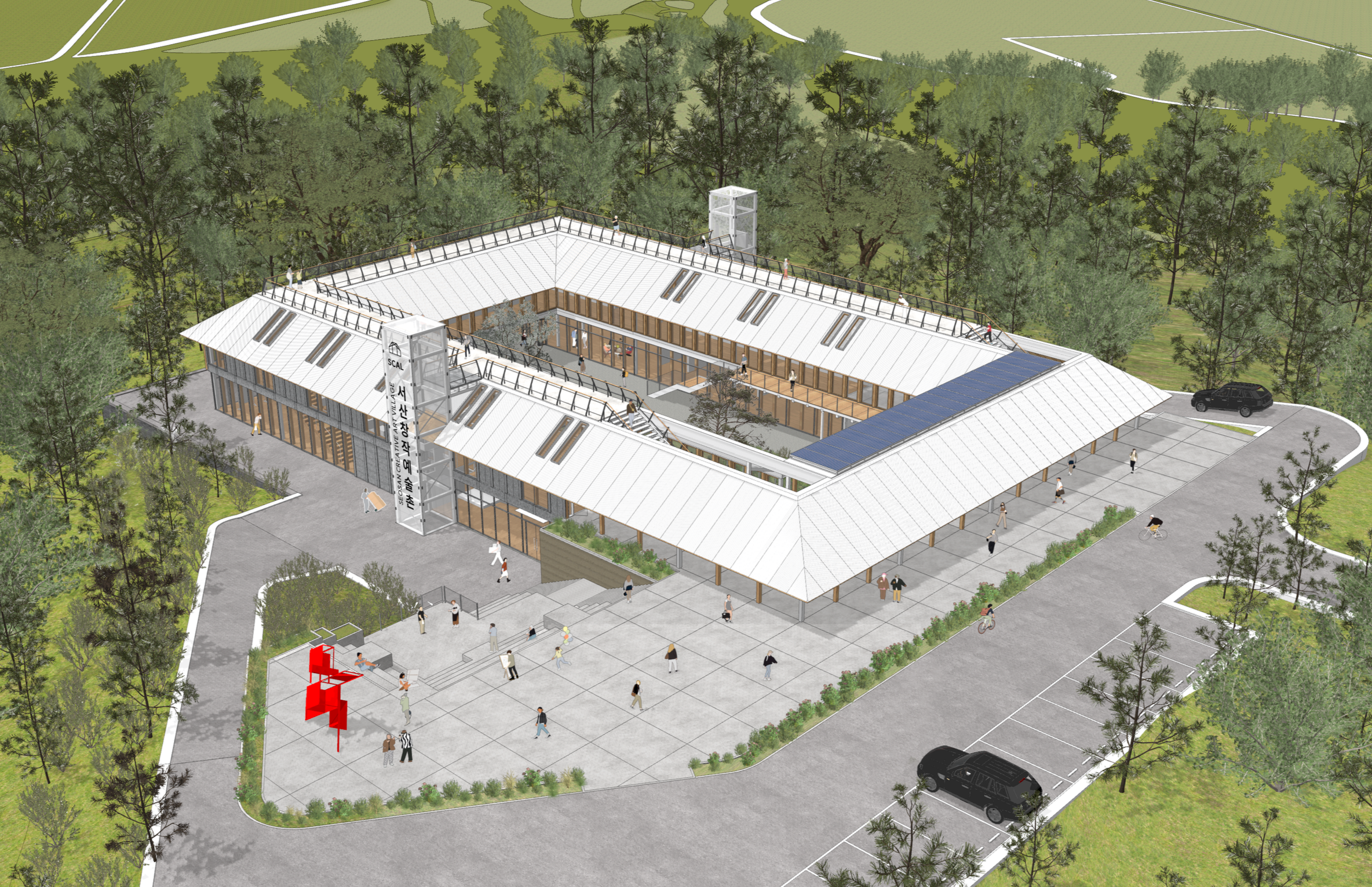 역시나 이 건물도 스펙타클의 함정에 빠지게 하고 싶지 않았다. 특히나 이 프로젝트 처럼 산중턱 , 주변에 아무것도 없는 환경이라면 더더욱. 여기서 스펙타클의 함정이란 세상을 구경거리로 보기만 하게 되는 상태가 되어 사람이 행위자로서 직접 살고 참여하는 것이 아닌 구경꾼이 되는 상태가 되는 것인데, 이로 인해 사람은 환경 즉, 건축물을 단편적 이미지로 소비하게 된다. 이로 인해 공간은 단순한 본질은 단순해지고, 쉽게 요약되며, 곧 소진된다.[1] 사용하는 사람의 삶과 함께 끊임없이 변화하고 적응하는 건축물과 단순히 멋지게 바라볼 수 있는 건물은 다르다. 여기에 더해 우리는 사용자의 정신건강을 걱정하기로 했다. 도시의 분주함에서 벗어나 산골에서 살면서 삶의 일환으로 예술을 해야 하는 예술 생산자들에게 이 장소는 휴식과 일할 수 있는 시간을 보장해주는 곳일 수도 있지만 지루함과 우울함과 싸워야 하는 공간일 수도 있다. 아무런 인프라가 없는 이곳에 우리는 적극적으로 아무것도 안 할 수 있는, 머리를 비우고 뇌를 휴식할 수 있는 공간을 기획했다. 그것은 건물 내외부를 아무 생각 없이 (또는 생각에 잠겨) 걸을 수 있는 가장 긴, 끊기지 않는 길을 제공하는 것이다. 집요하리 만치 끊이지 않는 길을 따라 걷다 보면 일반적인 보폭으로 15분간 쉬지 않고 이동할 수 있다. 이 이동을 통해 사용자는 건물의 내부와 외부를 들어오고 나가며 옆 작업실에서 뭘 하는지 기웃거리고 지금 무슨 전시를 하고 있는지 볼 수 있다. 회랑은 옥상으로 연결되어 서산 주변의 꽤 아름다운 산세와 멀리 뻘 밭에 가까운 바다를 보며 편안한 멍때리기가 가능하다. 같은 공간을 더 오래, 낮은 밀도로 사용하기.